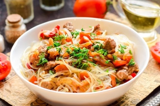 Сегодня фунчоза является не только вкусным, но и популярным блюдом. Впереди Вас ждет замечательный рецепт, который понравится любителям острой и японской, корейской и азиатской кухни. Отдельно стоит отметить как сочетаются говядина и сладкий перец, что подчеркивается нежным вкусом фунчозы. В уже готовое блюдо, на свое усмотрение, можно добавить зерна кунжута, соевый соус, тертый сыр. И в выборе специй можно смело довериться своему вкусу. Итак, нам понадобятся: Начинаем приготовление Изначально займемся очищением всех овощей: лука, моркови, перца, затем лук моем и просушиваем. Лук нарезается кубиками небольшого размера. Очищенную морковь также моем, просушиваем и нарезаем полосками и небольшими кубиками. Допустимо нарезание и соломкой под стать самой фунчозы. Далее беремся за сладкий перец, его тоже моем. Предварительно на нем удаляем и все перегородки. Нарезаем перец небольшими кусочками, можно соломкой. На говядине, при необходимости, удаляются имеющиеся прожилки, а нарезают мясо то