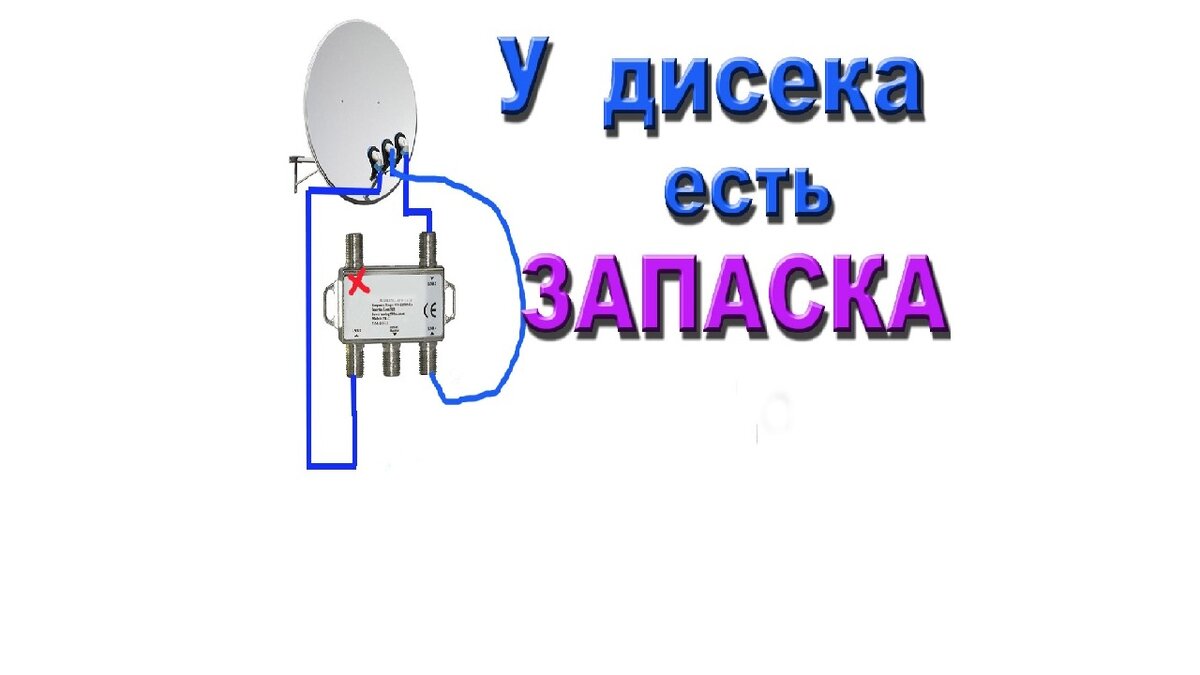 У большинства пользователей спутникового телевидения тарелка имеет 3 головки и настроена она на 3 спутника. Все они подключены к дисеку Из него выходит один кабель и идёт к нам в дом к тюнеру. А Дисек, если кто не знает, имеет четыре входа и один выход А значит у нас есть один запасной вход. Это как запаска на автомобиле. Пробили колесо — используем запаску. Также и здесь если у нас вышел из строя один из входов дисека у нас всегда есть под рукой запасной. Переключаем головку на него и дальше смотрим телевизор. Это сработает только в том случае если у вас пропал сигнал на одном из спутников. А остальные по-прежнему работают. Тут нам и пригодится наша «запаска», а точнее наш свободный порт дайсика. Перекручиваем кабель от головки на этот свободный порт. Обязательной это нужно делать на выключенном тюнере. Потом включаю тюнер. На этом все манипуляции закончились. И продолжаем дальше наслаждаться просмотров телеканалов.