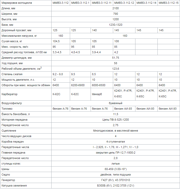 Двигатель: Двигатель одноцилиндровый, с воздушным охлаждением и двухканальной возвратной продувкой. Головка цилиндра из алюминиевого сплава. Чугунная гильза цилиндра запрессована в алюминиевое оребрение. Развитое оребрение цилиндра и головки обеспечивает эффективное охлаждение в тяжелых дорожных и погодных условиях. Двигатель работает на смеси низкооктанового бензина А-76 практически с любым сортом моторного масла. Двигатель на модели ММВЗ-3.112 1982 года выпуска развивал мощность 12 л.с. при 6 300 об/мин, в 1986 году появилась новая модификация — ММВЗ-3.112.11 с дефорсированным двигателем, чтобы мотоцикл мог эксплуатироваться не только на шоссейных дорогах. Трансмиссия: Коробка передач четырёхступенчатая. Механизм переключения передач — ножной. Сцепление многодисковое, в масляной ванне. Привод на заднее колесо — цепью, с защитой главной передачи штампованными кожухами и резиновыми чехлами цепи. Ходовая часть: Рама трубчатая, закрытого типа. Передняя вилка телескопического типа с