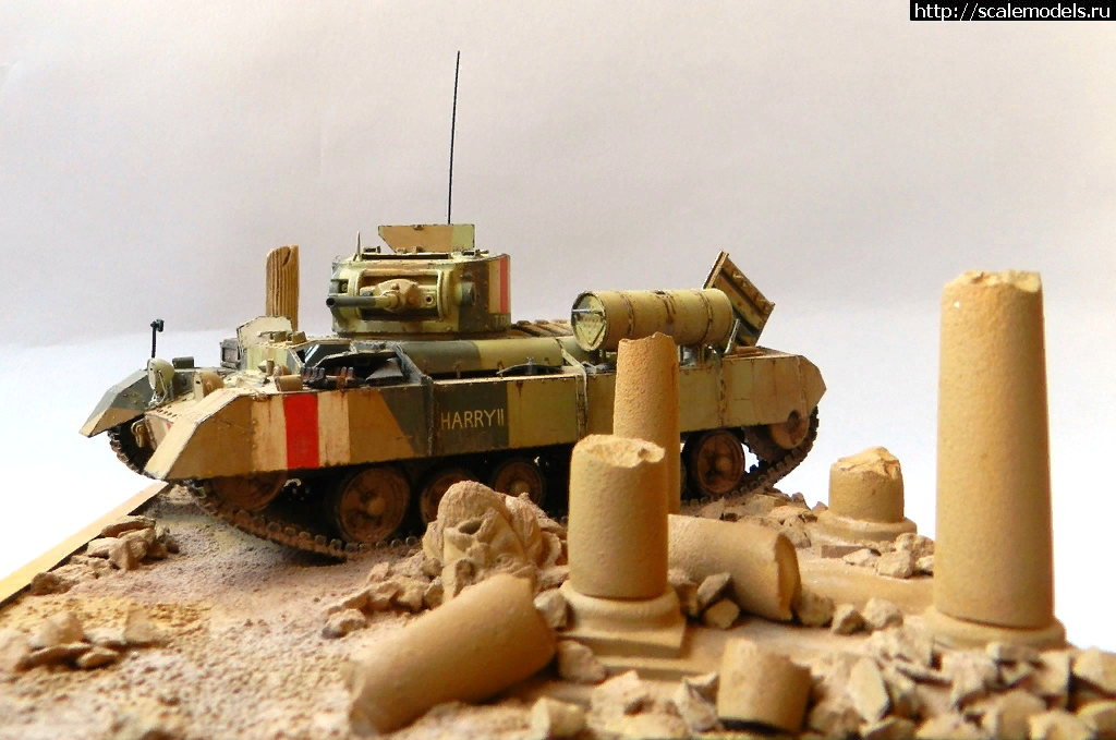 В целом, сборка модели особых сложностей не вызвала, хорошая стыкуемость деталей, практически полное отсутствие облоя и утяжин. Для деталировки модели присутствует некое подобие салона и двигателя, что некоторых моделистов может подвигнуть на полную деталировку салона - но это будет не легкая задача. Кстати, наличие двигателя предопределило сюжет всей диорамы. Идея была такова - Ливия, период Войны за Африку в рамках Второй Мировой Войны. Британский танк с десантом попадают в неразведанную местность с руинами древнего Римского храма. Так как местность красивая, двое из десанта, пока члены экипажа проверяют все ли в порядке с танком (поэтому их просто нет на диораме), решают сделать фото на память на древних руинах. Мало ли, может больше никогда здесь не доведется быть?
