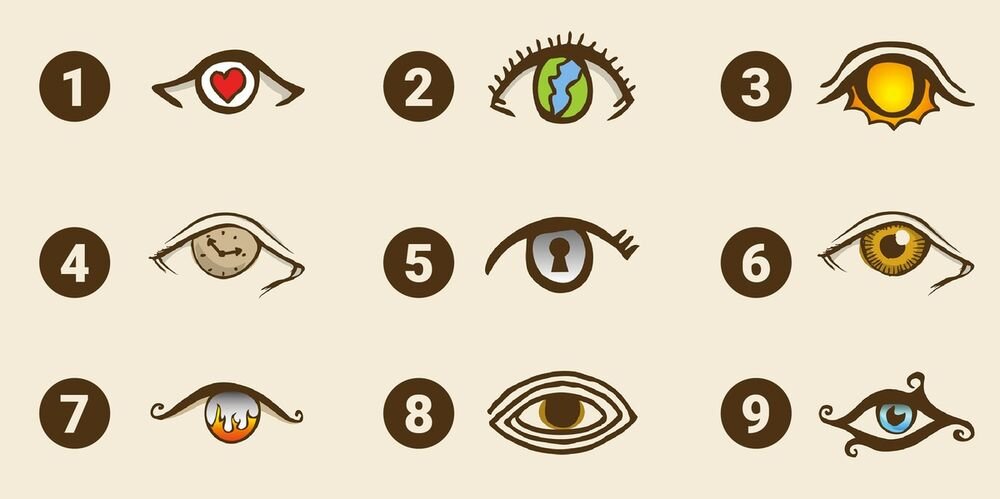 Пробегитесь глазами по 9 картинкам теста, сперва сверху вниз, а затем снизу вверх. Выберите один глаз, который Вас привлекает, и один глаз, который вызывает отторжение или неприятные чувства. Запомните номер первого и второго глаза, которые Вы выбрали. Первая картинка глаза означает характеристику личности, которую Вы принимаете в себе. Вторая картинка глаза покажет Вам на описание личности, которую Вы терпеть не можете в других людях. И которая, возможно, есть в Вас самих. 1. Доверчивая личность Вы тип человека, который пускает почти любого в свою жизнь и сердце. Вы считаете, что лучше рискнуть и получить травму, чем закрыть себя от людей. Вы никому не показываете свои страхи и неуверенность. Вы считаете, что сами должны решать свои проблемы. Вы пытаетесь отдавать всего себя людям, даже если у самого на Душе кошки скребут. Помогая другим, Вы залечиваете свои раны. 2. Педантичная личность Вы тип человека, который всегда пытается произвести хорошее впечатление и поступать правильно. Вы