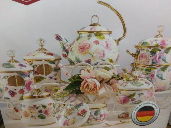 Некоторое время назад я была в магазине "Европа". Поразило меня тогда, что появилась в этой сети эмалированная посуда фирмы "Агнесс". Причем по цене, как мне показалось, ниже, чем на "Вайлдберриз" или телемагазинах. Зайдя сегодня в этот магазин увидела, что ассортимент магазина пополнился. А еще - распаковали большую кастрюлю, объемом 7,5 литров. Чтобы можно было рассмотреть более подробно всю эту красоту: Пионы - главное украшение и ягоды ежевики) А вот ручка на крышке - красиво, конечно же, но, как мне кажется- не совсем удобная в использовании. Все же мы готовим в посуде, а не любуемся. Как ее отмывать? Да и ручки на кастрюле. Чтобы поднять горячую нужны прихватки. Не очень удобно. Конечно, есть кастрюльки не такие красочные, обычные. Но, смею предположить - более удобные: Но вернусь к серии "Винтаж". Посмотрите, пожалуйста, какая красивая тортовница. В прошлый раз не было в магазине. Воистину будет украшением стола. Правда, цена высока - 2500 руб. Видите, и на ножке есть ри