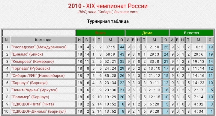 Всем привет, друзья! Пока весь русский футбол на паузе, мы решили рассказать вам историю ФК «Полимер»(Барнаул) в чемпионатах ЛФЛ. 2010 ГОД Сегодня мы расскажем о "XIX чемпионате России. ЛФЛ. Зона: Сибирь. 2010 год" Чемпионат 2010 года Полимер закончил на 8 месте. На чемпионат заявилось 10 команд: ФК "Распадская" (Междуреченск) ФК "Динамо" (Бийск) ФК "Кемерово" (Кемерово) ФК "Торпедо" (Рубцовск) ФК "Сибирь-ЛФК" (Новосибирск) ФК "Барнаул" (Барнаул) ФК "Зенит-Радиан" (Иркутск) ФК "Полимер" (Барнаул) ФК "СДЮШОР-Чита" (Чита) ФК "СДЮШОР-Динамо" (Барнаул) Все матчи ФК "Полимер" (Барнаул)(порядок правильный): ФК "Полимер" (Барнаул) 0:1 ФК "Распадская" (Междуреченск) ФК "Полимер" (Барнаул) 1:4 ФК "Кемерово" (Кемерово) ФК "Барнаул" (Барнаул) 1:0 ФК "Полимер" (Барнаул) ФК "Торпедо" (Рубцовск) 0:1 ФК "Полимер" (Барнаул) ФК "Полимер" (Барнаул) 1:1 ФК "Динамо" (Бийск) ФК "Полимер" (Барнаул) 0:2 ФК "Зенит-Радиан" (Иркутск) ФК "Полимер" (Барнаул) 3:1 ФК "СДЮШОР-Чита" (Чита) ФК "СДЮШОР-Дин