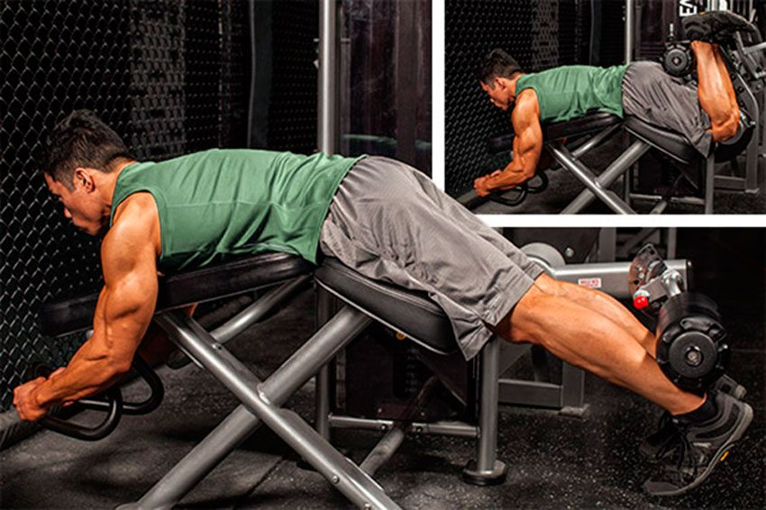Упражнение сгибания ног в коленях на специальном тренажере предполагает развитие подколенных сухожилий. Техника упражнения следующая: Сначала лягте на скамейку тренажера лицом вниз. Поместите за рычаг тренажера голени, при этом колени будут находиться на самом конце скамейки. Обязательно сохраняйте неподвижным таз, потянитесь к ягодицам пятками. При этом согните ноги в коленных суставах (угол составляет примерно 90°). На секунду задержитесь в этом положении, после чего можете возвращаться в исходную позицию. Чтобы сохранить постоянное напряжение сухожилий, слегка коснувшись конца скамьи ногами при возвращении в исходное положение, немедленно начните выполнять очередной повтор. Внимание! Нужно помнить, что положение ступней позволит вам варьировать углы, под которыми осуществляется воздействие на подколенные сухожилия. Это необходимо для достижения разного уровня усиления тренировочного эффекта на заданном участке. Например, если носки вытянуты вперед или загнуты назад, при эт