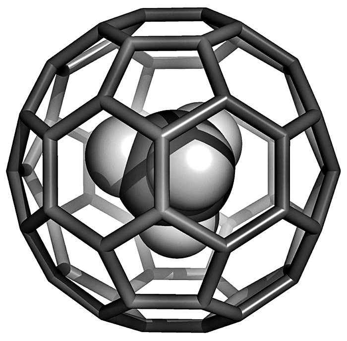 Исследователи из Саутгемптонского университета впервые получили фуллерен C60, в полость которого заключена молекула метана. Так метан стал первой органической молекулой, которую удалось замуровать в самом известном фуллерене C60 («Angew. Chem.», Int. Ed. 2019, 58, 15, 5038-5043; doi: 10.1002/anie.201900983, полный текст). После открытия фуллерена C60 в 1985 году стало ясно, что его практически идеально сферическая внутренняя полость диаметром 3,7 Å позволяет изолировать отдельные атомы. С той поры соединения включения (эндоэдральные фуллерены), в которых молекулы или атомы находятся в клетке фуллерена, стали объектом интенсивных теоретических и экспериментальных исследований. Их формулу принято записывать как A@C60, где А — частица, заключенная в полости полимера. Исследователи уже получили такие эндоэдральные фуллерены, как Н2@C60 и Н2О@C60: они сформировали в фуллерене отверстие, ввели через него молекулы водорода и воды, а потом закрыли «вход». Чем больше молекула, тем большее отве