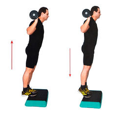 Данное упражнение, которое мы хотим вам представить, направлено, в первую очередь, на тренировку икроножной мышцы. Техника упражнения Для начала поставьте на платформу подушечки ступней таким образом, чтобы ваши пятки располагались за ее краем. Они должны максимально свободно подниматься и опускаться по своей допустимой амплитуде. Следите за тем, чтобы носки были немного разведены в стороны, они также могут быть параллельны. В полной мере выпрямите торс и ноги. Пятки, таз, а также плечи у вас располагаются в одной вертикальной плоскости. Внимание: плавно опуститесь на пятках, разгибая голеностопный сустав. Опускайтесь до тех пор, пока вы не почувствуете, что икроножные мышцы и ахиллесовы сухожилия растянуты максимально. Теперь сделайте глубокий вдох и напрягите икры, задерживая дыхание. Одним мощным движением как можно выше поднимитесь на носках. Остановитесь в верхней точке на несколько 1-2 секунды. Старайтесь напрячь икры максимально сильно. Расслабьтесь немного, и плавно опуститес