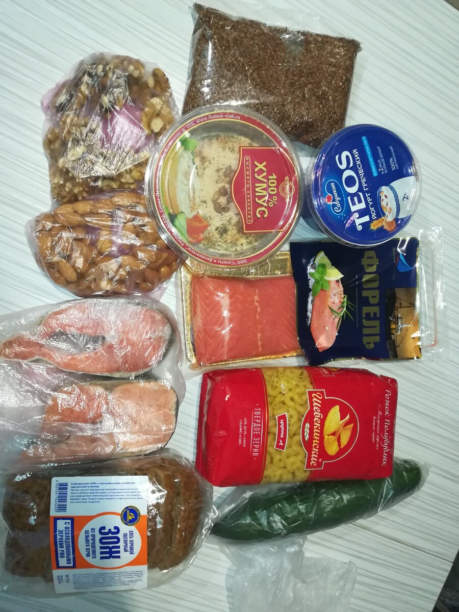 Здравствуйте, возможно вам будет интересен рацион моего питания на день. Хочу рассказать как я питаюсь практически каждый день, для меня нужно 1700 калорий. Вот такие продукты я закупаю приблизительно раз в 3-4 дня, тут конечно же не все продукты, но все же большая часть Орешки идут всегда в перекус или на салат, так же как и семена льна, все это очень полезно и должно быть в вашем рационе! Это обязательно должен быть цельнозерновой хлеб, для меня это быстрый и правильный завтрак, раза 2-3 в неделю готовлю кашу геркулес, но просто практически всегда хочется поспать, и завтраки получаются такие. 1. Геркулесовая каша на молоке: всегда одни и те же пропорции... 40 грамм овсянки и 100 грамм молока, ещё конечно же добавляю воды, около 100 грамм, в зависимости от каши 2. Бутерброды на цельнозерновом хлебе... Это 2 кусочка хлеба, хумус, авокадо, красная рыба и можно добавить огурчик или зелень На данном фото выше это был выходной день, когда я поздно проснулась и поняла, что нужно набира