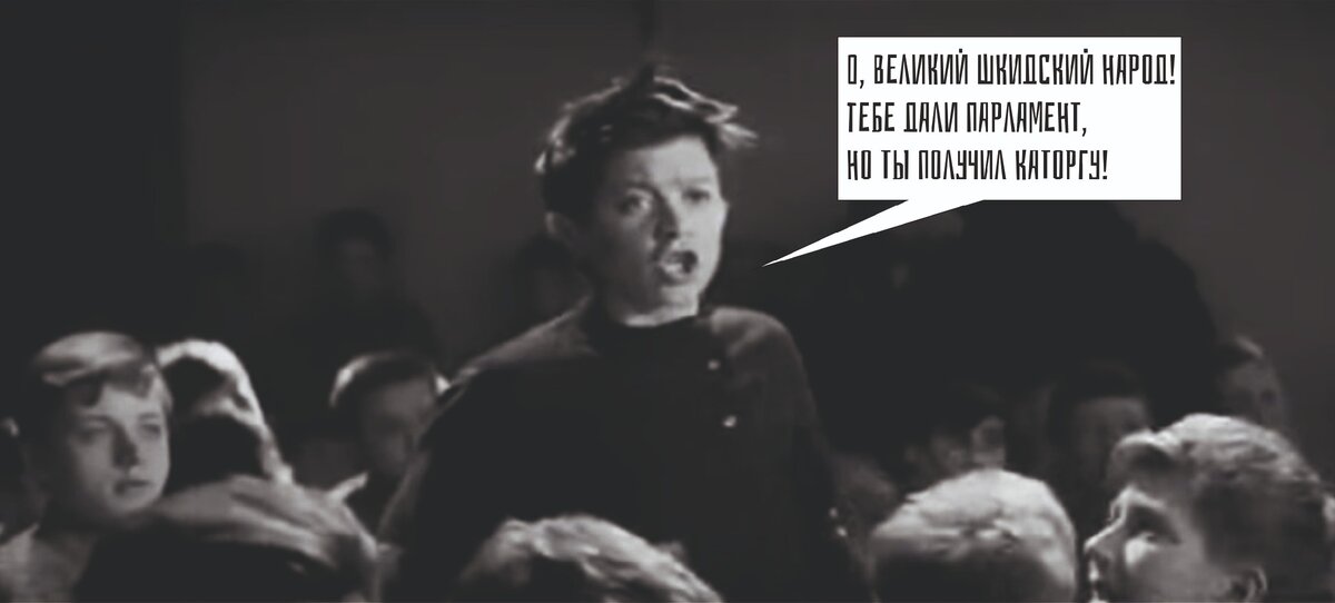 Вероятно, те, кто успел зацепить советское время помнят фильм «Республика ШКиД».Там есть эпизод, в котором Викниксор провозглашает самоуправление, и одновременно вводит изолятор, а воспитанник «Японец» на это эмоционально реагирует: «О, великий шкидский народ! Тебе дали парламент, но ты получил каторгу!». В книге это событие описано несколько по-иному. Намного шире. Пересказывать не буду, цитировать тоже, выдерну несколько фрагментов, как говориться из контекста: « – Итак, прошу внимания. Что такое наша школа? Это – маленькая республика. (Это Викниксор говорит). – Пожалуй, скорее – монархия, – ехидным шепотом поправляет зава Японец. – Наша школа – республика, но в республике всегда власть в руках народа. У нас же до сих пор этого не было. Мы имели, с одной стороны, воспитанников, с другой воспитателей, которыми руководил я. Этим, так сказать, нарушалась наша негласная конституция. – Правильно! – несется приглушенный выкрик из гущи воспитанников. Викниксор грозно хмурит брови, по тут же