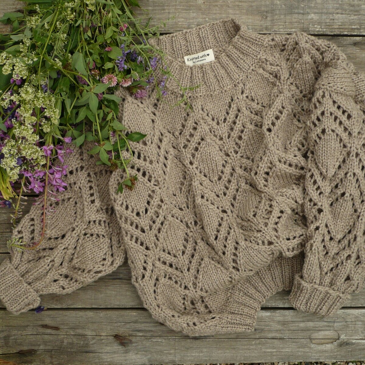 Я в этом году связала несколько джемперов с ажуром из мериноса. В бежевом, с первого фото, использован достаточно объёмный меринос-шнурок. Нить выполнена в виде цепочки.