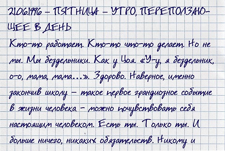 ничего не должен. Все решаешь сам. Теперь. Конечно, родители хотят, чтобы я… мы… что-то там делали… чаще убирали комнату, выносили мусор, мыли за собой посуду, не разбрасывали где попало вещи, и многое… хотя не так уж и многое… поэтому просто «и другое»… С понедельника вообще пойдут разговоры относительно того, что мы планируем делать дальше, куда поступать и прочая муть. Хотя что касается меня (надеюсь нас), я бы с удовольствием предстоящий год посвятил бы новому увлечению… Но, боюсь, родители будут против. Уверен, будут против. И совсем не уверен, что мы сможем их как-то переубедить. Хотя в действительности мы же с шести пошли – мы этот год заслужили! Но… Как я уже написал – Родители хотят, а мы что? Мы это делаем. Конечно. Но как мы это делаем? А делаем мы это не напрягаясь. И это прекрасно. Нет обязаловки. Совсем. Отец, например, рассказывал, что у него каникулы зачастую превращались в куда более серьезное обязалово, чем школа. С его мамой, для нас - с нашей бабушкой, было не посп