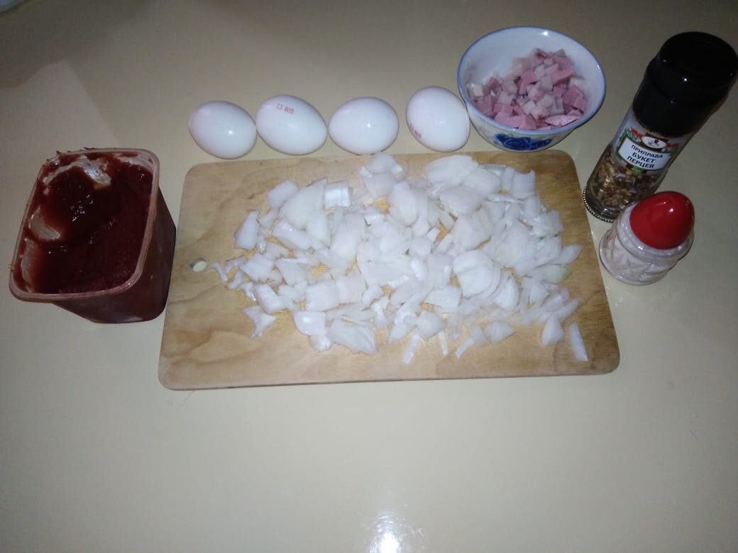 Всем, привет! Хочу поделиться рецептом простого, но очень вкусного завтрака. Когда его готовлю, мужа за уши не оттащишь) Для приготовления нам понадобятся: Яйцо куриное - 4 шт. Ветчина куриная - 100 гр. Лук - 1 шт. Томатная паста - 2 ст. ложки. Соль\перец - по вкусу. Лук нарезать и слегка обжарить. Добавить томатную пасту, перемешать и дать потушиться 5 минут. Добавляем ветчину, продолжаем тушить еще 5-10 минут. Разбиваем яйца. Белок перемешиваем с поджаркой, желтки оставляем целыми. Солим, перчим и жарим до готовности. Наш завтрак готов! Приятного аппетита! Всем спасибо за просмотр, надеюсь эта статья была полезной. Если понравилось, ставьте палец вверх, подписывайтесь на канал. Здесь вы найдете интересные кулинарные решения, полезные советы, обзоры на известные сериалы и даже статью про заброшенный город)