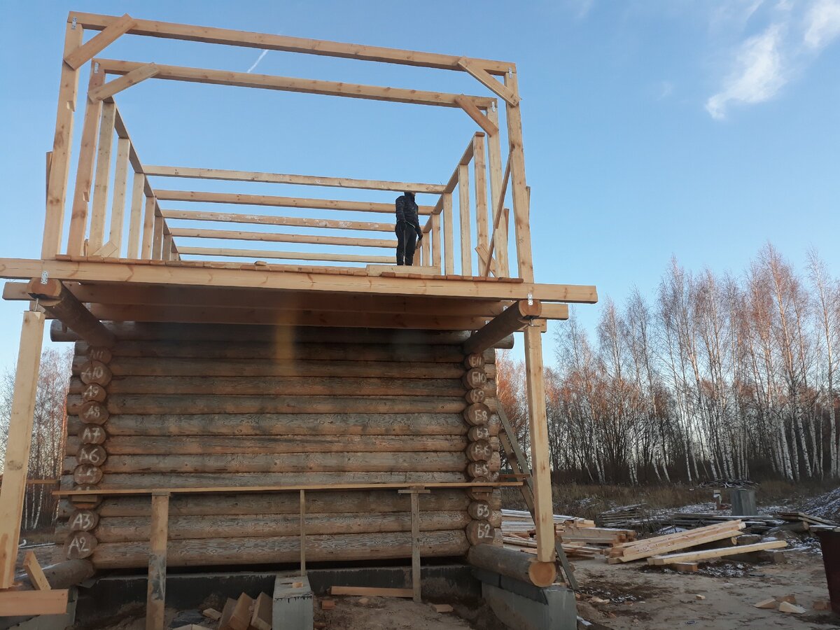 И Вот пришла поздняя весна !!! пока что днем стояла теплая погода, мы решили продолжать стройку и нам нужно было делать крышу на дом. Долго тоже думали, как делать и решили делать сами так как сделать каркас мансардной крыши нам приблизительно в 180 000 рублей чисто за работу. И вот по выходным дням мы начинали с женой делать каркас мансардной крыши, больше времени мне приходилось работать одному так как жена работала в графике 2*2 и до 22:00 часов вечера. Сначала мы ставили стойки крыши из бруса 100*200 на лаги пола второго этажа. ( если не считать цоколь этажом) и фиксировали их к лагам усиленными уголками или соединительной пластинкой. На верх стоек мы уложили доску 50*100 мм и сшивали ее к стойкам в заранее измеряя их по диагонали и по вертикали. И когда у нас были закреплены стойки, мы укладывали горизонтальные лаги из бруса 100*200, в заранее сделав паз на каждой стороне на фотографии это хорошо видно. Работать приходилось и в дождь и в снег и конечно в солнечную погоду
