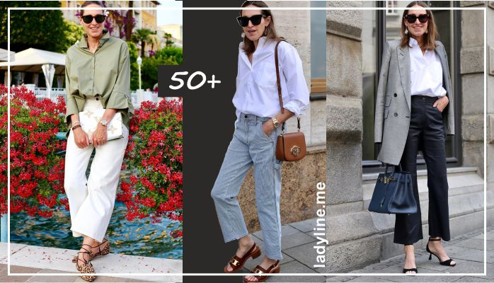 Модные и пронзительные женственные аутфиты, которые без сомнения вдохновят вас, представлены в данной публикации. Грациозный look состоящий из розовой плиссированной макси юбки, оверсайз бежевого свитера и бежевых мюли с острым мысом отлично молодит и придает женщинам возраста 50+ шарм и утонченность. Рубашка оверсайз с пышными рукавами стильного цвета хаки + широкие белые брюки с высокой посадкой + остроносая обувь в трендовый анималистический принт — отличное сочетание базовых вещей. Ярко-голубой оверсайз свитер в комбинации с белыми укороченными брюками и голубыми сабо на небольшом устойчивом каблуке выглядит современно и стильно на грациозной женщине зрелых лет. Классический и строгий аутфит взрослая дама может собрать для себя благодаря белой базовой рубашке, удлиненному жакету, а также укороченных черных брюк клеш. Платье оверсайз цвета хаки с пышными рукавами и акцентом на талии отлично сочетается с минималистическими босоножками с тонкими перемычками. Правильный крой платья в