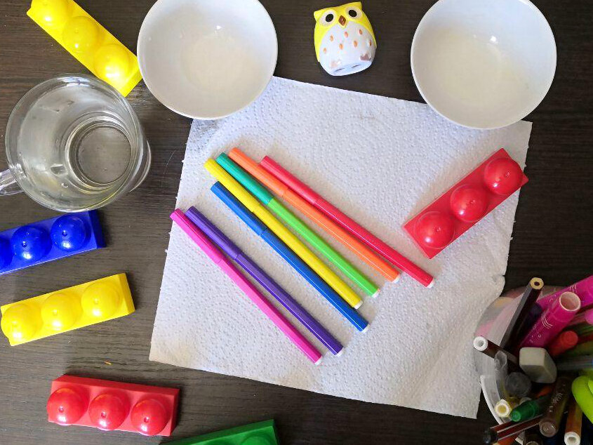 Цветную часть опускаем в воду, а другую в пустую чашу и наблюдаем. Радуга побежит довольно быстро.