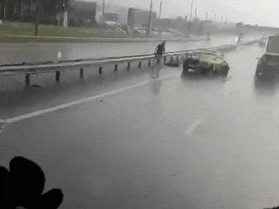 На Московском шоссе в Рязани водитель ярко-зелёного Lamborghini Huracan Performante не справился с управлением на мокрой дороге