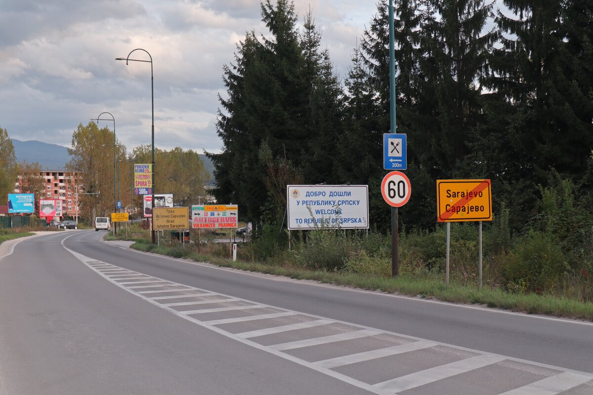 На одном из въездов в город со стороны основной территории республики Сербской, поставили вот такие стелы. Т.е. знайте, что вы въезжаете ещё только в Источно-Сараево, а не в само Сараево.