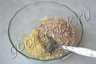 Смешать его с сахаром и орехами. Добавить яйцо. Слоёное тесто очень тонко раскатать прямо на бумаге для выпечки (размер пласта примерно 25х30см).