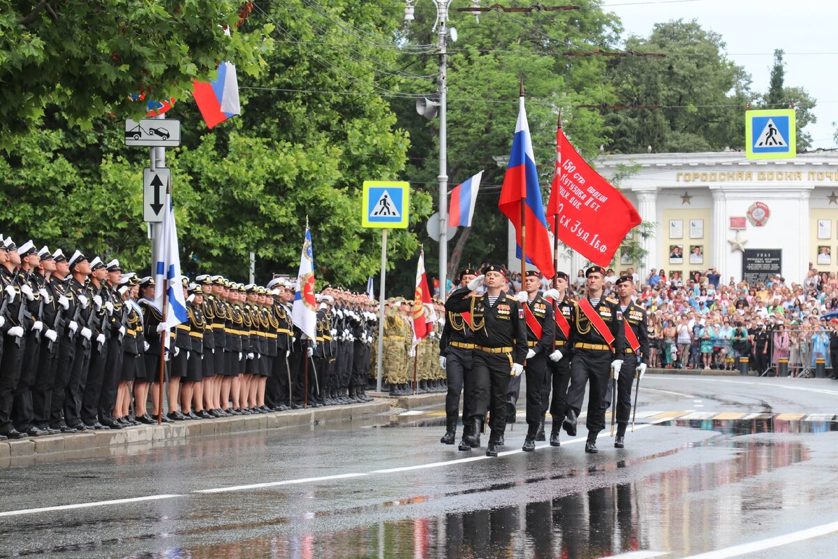В торжественном шествии приняли участие парадные роты военнослужащих ЧФ, Морской авиации и ПВО ЧФ , парадные расчеты Росгвардии и МЧС России, курсанты Черноморского высшего военно-морского училища им. П.С. Нахимова. Наравне с парнями прошел сводный парадны