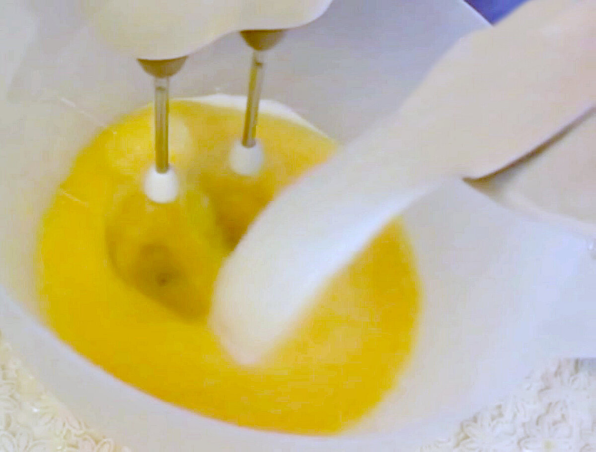 2 Прибавить муку смешанную с разрыхлителем. Взбивать миксером до тех пор, пока масса не станет однородной.