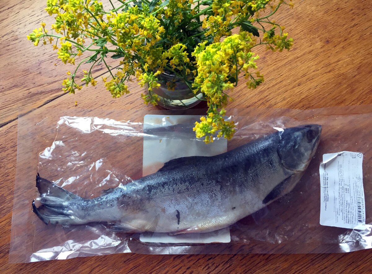 Не я автор этой гениальной идеи, я давно о таком слышала, а еще такой рыбой меня угощала подруга, но у самой все как-то руки не доходили попробовать. И вот, наконец, дошли. Знакомьтесь, это мороженая горбуша из Пятеры. Ясно, что больших гастрономических откровений все это не обещает. Другими словами, не страшно экспериментировать - хуже не будет. Как и с любой мороженой рыбой, главное правильно ее разморозить. Это значит, как можно медленней. Поэтому достаем ее из морозилки сильно заранее и кладем размораживаться на нижнюю полку холодильника. Ей на это понадобятся примерно сутки. Пакет у нее крепкий и герметично запаянный, так что у меня было большое искушение прямо в нем, не вскрывая, и готовить. Но, не без сожаления, я от этой идеи все-таки отказалась - во-первых, на этом пакете не написано, что он предусматривает те