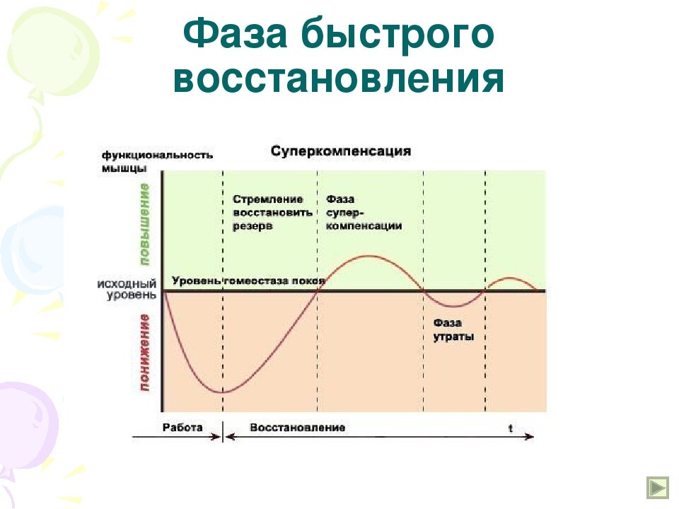 В первой и второй фазах протекают восстановительные процессы до достижения характеристик организма перед тренировкой. То есть твои ресурсы восполняются до прежнего уровня.