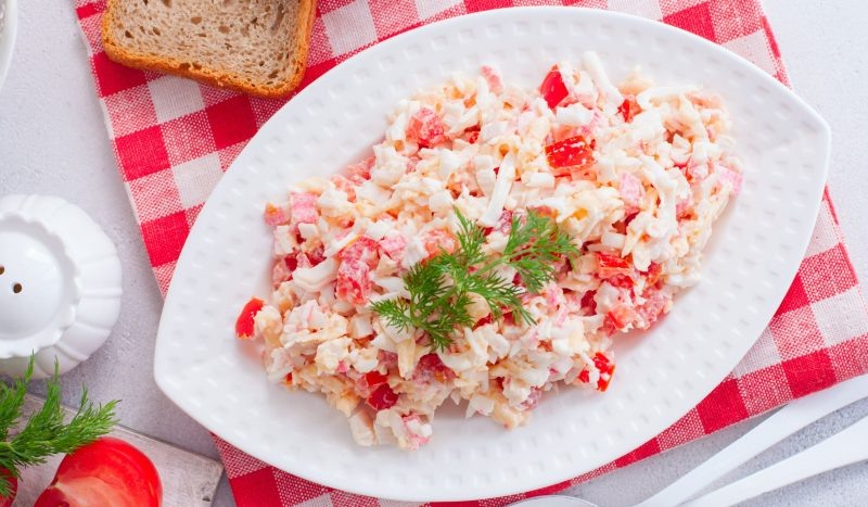 Крабовые палочки и томаты прекрасно дополняют друг друга. Сыр делает салат более нежным, а чеснок придаёт ему яркий аромат. Ингредиенты 1. Помидоры 2–3 штуки 2. Крабовые палочки 200 г 3. Твёрдый сыр 100 г 4. Чеснок 2–3 зучбика 5. Майонез по вкусу Приготовление 1․ Из помидоров извлеките мякоть. 2․ Нарежьте томаты и крабовые палочки небольшими кусочками. 3․ Сыр натрите на тёрке. 4․ Чеснок пропустите через пресс или мелко порубите ножом. 5․ Смешайте все ингредиенты, добавьте майонез и перемешайте. 6․ Перед подачей дайте салату настояться 5–10 минут.