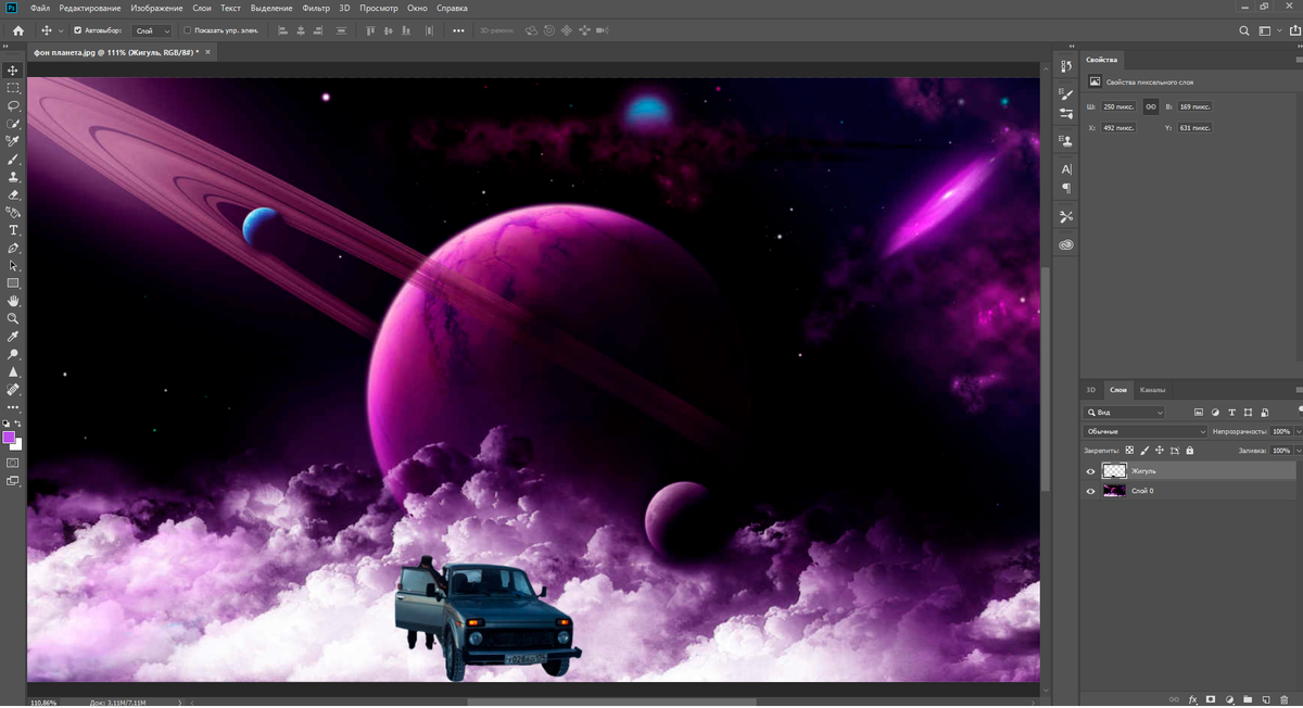 Допустим, вы прифотошопили какой-то объект к другому фону, и это слишком отчетливо видно, так как цвета явно отличаются. Вот, к примеру, я хочу, чтобы нива бороздила открытый космос, почему бы нет? Но тут прям очень видно отличие в цветах. Как минимум, свет от планеты должен быть фиолетовым, а нижняя часть более светлая, так как там и фон более светлый. Короче, здесь много проблем, но не волнуйтесь, я покажу, как всё исправить. Самое первое и главное - это выбрать раздел "Изображение" (предварительно нажав на необходимый слой), теперь "Коррекция". Тут будет много настроек, разберем главные из них. Первая - это "Яркость/Контрастность". Нажав, вы увидите небольшое окошко, в нем будет два ползунка: верхний -это "Яркость", можно задать значение с помощью ползунка или же выставить более точно, используя небольшое окошко с цифрами. Всё тоже самое можно сделать и с " Контрастностью". После завершения настроек нажмите "ОК", и настройки будут применены. Далее у нас идут "Уровни", вообще, это