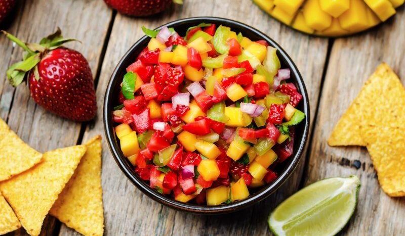 Очень необычная вариация знаменитого мексиканского соуса, похожего на салат. В этой сальсе прекрасно сочетаются кисло-сладкие ягоды и ароматное манго, острый перец и лук, свежая зелень и лаймовая заправка. Подавайте блюдо с чипсами из тортильи, начиняйте тако или дополняйте им мясные блюда. Кстати, в одной порции всего 56 ккал. Ингредиенты 1. Манго 1 штука 2. Клубника 400–450 г 3. Халапеньо или другой острый перец 1 штука 4. Фиолетовый лук ¹⁄₄–¹⁄₂ штуки 5. Петрушка 4–5 веточек 6. Мёд 1–2 ч. ложки 7. Лайм 1 штука 8. Соль 1 щепотка Приготовление
