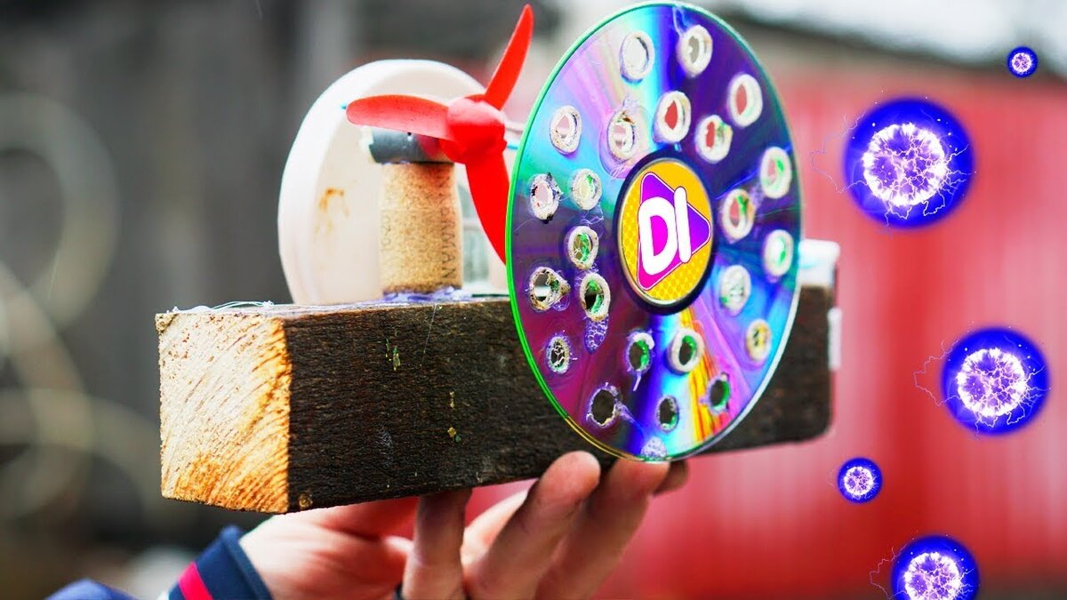 Привет, сегодня сделаем что-то интересное из целой кучи всяких разностей. И для начала, я взяли паяльник, включил его в сеть, а потом с его помощью сделал отверстия в диске. Затем нам нужно проколоть по центру пробку от бутылки, вклеили в отверстие пастик от голевой ручки, и все это приклеили к нашему диску. Потом я пошёл в сарай и взял оттуда ножницы по металлу и кусок профиля для гипсокартона, а выходя из него прихватил ещё и брусочек, он нам тоже понадобиться. Из профиля, вырезаем пластинку, закругляем её края и сгибаем её так как показано на фото. Также на краях пластины нам понадобиться отверстия, их тоже делаем, а затем прикручиваем пластину к бруску. В отверстия на краях, вставляем наш модернизированный диск, который сделали в начале. С обратной стороны этого изобретения вставляем пластиковую крышку, в которой изначально делали отверстие по центру. Дальше все склеиваем термоклеем. Затем обрезаем кусочек оплетки от кабеля и надеваем его на вращающийся кончик моторчика. Сам же м