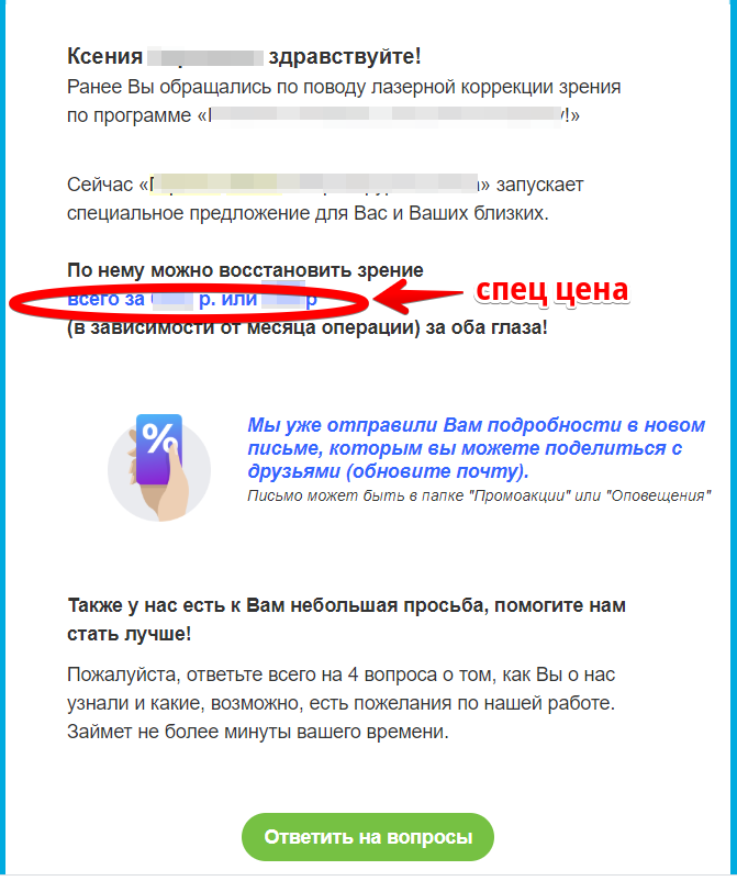 Однажды в центр микрохирургии глаза поступила заявка. Звонил клиент и спрашивал, сколько стоит лазерная коррекция зрения и как вообще проходит процедура. Консультант все подробно рассказал и попросил клиента скинуть почту в Вотсапе, чтобы прислать рекомендации по подготовке к операции. Итого: есть email клиента, есть телефон. Сам клиент отказался от операции по каким-то своим причинам и о нем благополучно забыли. Наступил 2020. С рекламы стало приходить меньше заявок, поток клиентов уменьшился. Нужно было придумать, что делать дальше. И пришел в глазной центр монетизатор баз. И сказал он, надо напомнить о себе тем лидам, которые вами интересовались И собрали они в кучу все клиентские контакты, которые не дошли до продажи, и написали им письмо со спецпредложением. ⠀ И клиенты вспомнили, записались на лазерную коррекцию, и жил центр микрохирургии после 2020 года долго и процветал. Потому что монетизатор баз знает, как работать со всеми клиентами в базе, а не только с горячими, только ув
