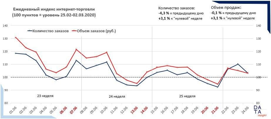 Мы ежедневно собираем данные с крупнейших интернет-магазинов (более 60% всех заказов в Рунете) и высчитываем индекс, как динамику заказов интернет-магазинов от "нулевой" недели (7 дней от 25 февраля). Данные Индекса на 25 июня 2020 (Data Insight): 23 июня, вторник Количество заказов 5,5% к предыдущему дню; 10,2% к "нулевой" неделе Объем продаж 10,2% к предыдущему дню; 3,1% к "нулевой" неделе 24 июня, среда Количество заказов 1,4% к предыдущему дню; -0,1% к "нулевой" неделе Объем продаж 5,1% к предыдущему дню; 3,1% к "нулевой" неделе "На неделе с 15 по 21 июня лидерами по абсолютному приросту продаж относительно предыдущей недели стали категории «Нервная система», «Пищеварительный тракт и обмен веществ» и «Сердечно-сосудистые препараты»". Пресс-служба АО НПК «Катрен» (Apteka.ru) Подробное описание: http://www.datainsight.ru/TradeIndex_daily #ecomvscorona