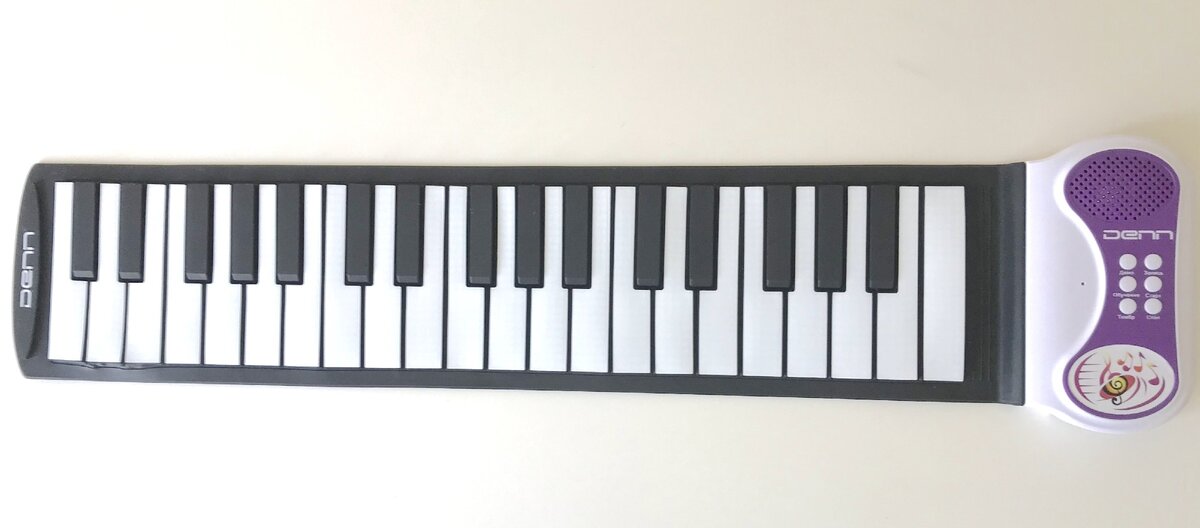 Всем добрый день! С вами Наталья Бекасова, руководитель музыкальной студии и педагог. Технологии не стоят на месте, и вот уже на рынке появились гибкие, плоские синтезаторы, которые просто перевернули представление о том, что инструмент должен быть обязательно объемным и трудно транспортируемым. Я хочу рассказать вам о достоинствах и недостатках таких синтезаторов на основе инструмента фирмы Denn. Гибкий синтезатор (или гибкое пианино) - это плоское, прорезиненное устройство с n-количеством плоских клавиш, нажимая на которые извлекается звук. Оно гибкое, его можно свернуть и положить в сумку; не боится воды и если по нему побегают детские ножки. За это его, конечно, ценят! В нем есть несколько режимов. Стоимость таких синтезаторов начинается в среднем от тысячи, и может доходить даже до 8-9. Такие синтезаторы есть в классическом оформлении черно-белых клавиш, а также в цветном варианте, который наиболее подходит для изучения нотной грамоты детьми. Первое безусловное достоинство -