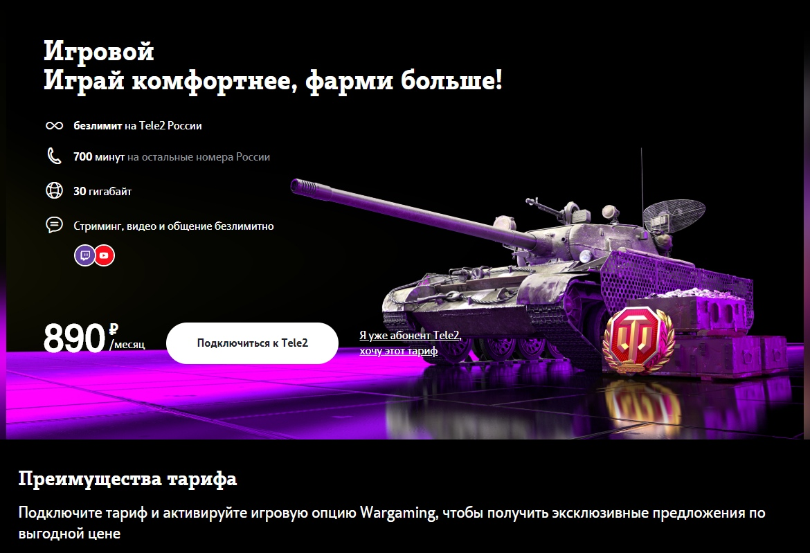 Появился новый способ получить все бонусы Тарифа «Игровой» для World of Tanks. Подключайтесь к мобильному тарифу от Tele2 и получайте бесконечный танковый премиум аккаунт, эксклюзивный премиум танк Т-44-100 (Р), прокаченный на 100% экипаж с нулевым навыком «Боевое Братство» и эксклюзивный пропуск и бонусы на различных игровых событиях и турнирах. А также безлимит на Теле2 по России, 700 минут на остальные номера России, 100 SMS, 30 Gb без ограничения скорости и безлимитный трафик на Youtube и Twitch. Стоимость тарифа во всех регионах - 890р Состав для игр Wargaming (World of Tanks/World of Warships/World of Warplanes).