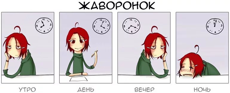 Люди , которые просыпаются рано и без ведра кофе, в хорошем рамположении духа и отдохнушими, называются жаворанками! А те кто готов убить вас утром, и раньше чем с 11:00 лучше их не трогать, им лчень тяжело дается раставание с любимой одеялкой, их буквально оно взяло в плен, называют себя совами, что придает им некую таинственности и загадочность. Жаворонки : Этот хронотип ранние пташки, поэтому просыпаются легко с восходом солнца. С самого утра они чувствуют себя бодрыми, отдохнувшими с позитивным мышлением. Более активны они с 9:00до 12:00, после чего им нужно отдохнуть до 16:00, а дальше наступает 2 пик активности и длится он до 19:00. Сон: Ранних птичек к вечеру уже клонит ко сну, поэтому они рано ложаться спать и очень быстро засыпают. Однако если жаворонки не смогли лечь спать во время , то поутру будут чувствовать себя разбитым и слабым. 9 Совы: Большинство сов самостоятельно просыпаются в 10-11часов утра. Ранний подъем дается им очень тяжело, иногда даже больно, и заставляют