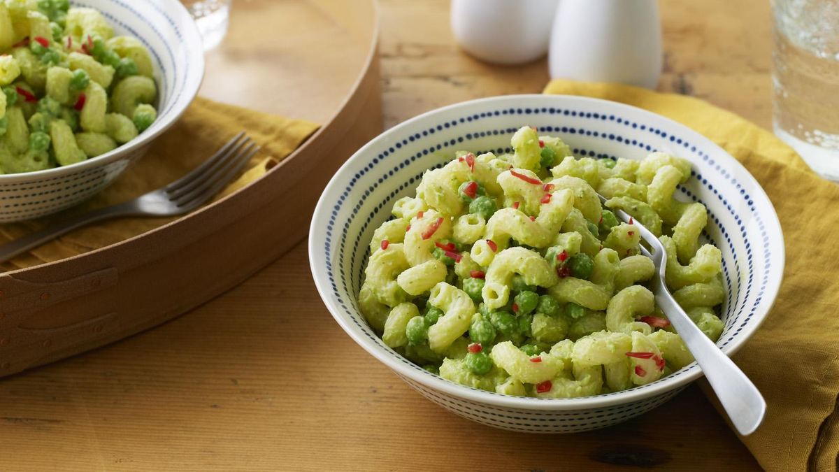 Ингредиенты Макароны по 375 г / 13 унций, такие как пенне или фузилли 1 большой авокадо (или 2 маленьких) 2 зубчика чеснока 2 столовые ложки кокосового масла, растопленного ½ чайной ложки соли 1 лимон, сок и цедра 6 свежих листьев мяты 150 г свежего горошка (или замороженного и размороженного) 1 большой красный перец чили (по желанию) _______________________________________________________________________________ Метод 1. Приготовьте пасту. Слейте воду и отложите в сторону. 2. Разрежьте авокадо, затем положите мякоть авокадо, чеснок, кокосовое масло, соль, лимонный сок, цедру и листья мяты в миксер с 4 столовыми ложками воды. (В качестве альтернативы вы можете положить все в миску или кастрюлю и использовать блендер.) 3. Смешивайте до получения гладкой массы. Если вы обнаружите, что смесь с трудом двигается, добавьте еще одну столовую ложку воды и попробуйте снова. Положите макароны в миску и залейте соусом. Добавьте горох и перемешивайте до тех пор, пока все макароны