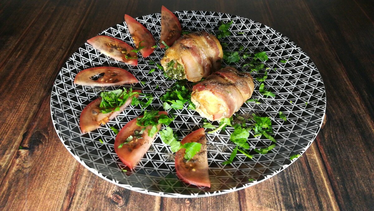 Процесс приготовления: Петрушку и кинзу мелко нарезать, помидор нарезать ломтиками. Куринную грудку нарезать тонкими пластинами, мариновать в горчице 30 минут, через 30 минут добавить много соевого соуса и выдержать грудки в соусе 3-5 минут, после чего извлечь грудки из соуса. Положить бекон на доску, сверху положить куриные грудки, посыпать зеленью, добавить помидор и завернуть в рулетики. Закрепить рулетики деревянными шпажками. Противень смазать подсолнечным маслом, в него положить приготовленные рулетики. Запекать в духовке в течении 20 минут при температуре 180 градусов. На тарелку выложить тонко нарезанные помидоры, посыпать зеленью и выложить запеченные рулетики. В самом конце рулетики и помидоры поперчить по вкусу.