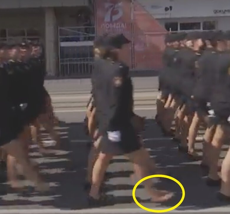 Девушку, продолжившую маршировать на параде Победы несмотря на потерянную туфлю, нашли и наградили. Случай, ставший известным на всю страну, произошёл на праздничных торжествах в Калининграде. Телекамеры с нескольких ракурсов запечатлели, как одна из участниц парада шла босиком. Впоследствии также нашли и момент, когда обувь слетела с ноги марширующей. Естественно, происшествие не укрылось и от внимания присутствовавших на параде. Командующий Балтийским флотом адмирал Александр Носатов сказал после торжества: «Вы мне, пожалуйста, ее представьте, я её отдельно поощрю. Потому что потеряв обувь, она не сбила строй. И даже никто не заметил. Поэтому отдельно мне её фамилию представьте. Будет поощрена приказом командующего!» Поиски героини не заняли много времени. Уже на следующий день выяснилось, что выдержку в строю сохранила мичман Ксения Кальчинская, фельдшер зенитно-ракетного полка ПВО Балтийского флота. В интервью «России-1» девушка рассказала о произошедшем: «Случайно так получилось,