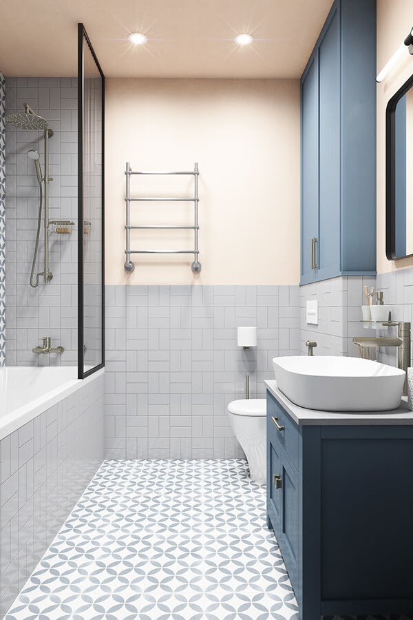 Проекты кухонь у нас были, проекты целых квартир — тоже, а вот проекты санузлов мы до сих пор упускали из виду. Исправляемся! И показываем нежную и уютную ванную комнату. Проект и визуализацию разработала дизайнер Манана Хучуа. Заказчик хотел, чтобы в санузле было много места для хранения и обязательно гигиенический душ. А ещё — чтобы дизайн был простой, но со вкусом. Нам кажется, что получилось замечательно. И действительно, нежность — первое, что приходит в голову, когда видишь эту ванную. Детали очень радуют редакцию: смотрите, как все продумано, даже держатель для фена есть — не придётся каждый раз после использования убирать нагревшийся прибор в тумбу. Ну а про важность гигиенического душа мы писали почти год назад, и с тех пор наша позиция не изменилась. К слову о месте для хранения: ниши для уходовой косметики отлично выглядят и гораздо удобней, чем всевозможные навесные полочки. Обратите внимание на сочетание цветов. Серый, серо-синий и персиковый образуют очень интересную г