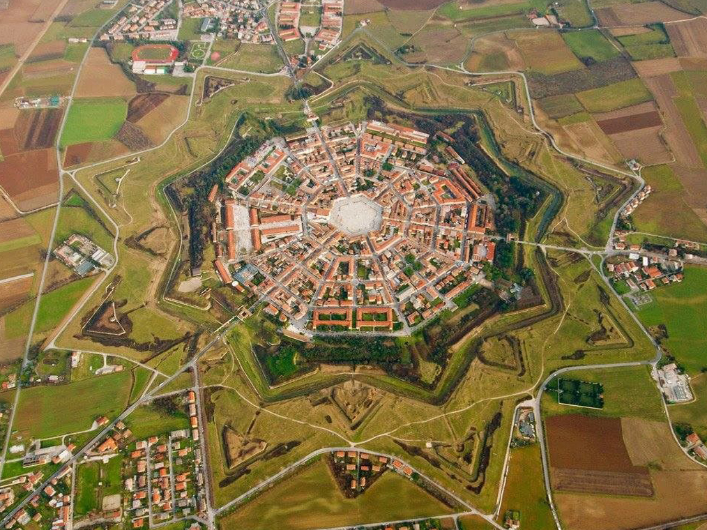 Венецианская республика конца 16 века, могущественная и очень богатая, уже начала чувствовать надвигающуюся угрозу от Османской империи. Чтобы обезопасить себя от нападения янычар на своих восточных границах, богатые венецианские дожи решили построить самую совершенную крепость, построенную по последнему слову технической и фортификационной мысли. Первые камни Пальмановы были заложены 7 октября 1593 года, ознаменовывающего разгромную победу над турками при Лепанто. А название было дано в честь венка, сделанного из пальмовых ветвей и являющегося символом победы. Посередине Фриулийской равнины инженеры под руководством Джулио Саворньяна начали строительство бастионной цитадели. Классические средневековые замки не могли устоять перед артиллерией, являющейся королевой войн того времени. Актуальным стало возведение фортов, напоминающих на плане своим видом звезды. Разветвленная система укреплений с обязательным присутствием бастионов, земляных валов до середины 19 века стала осново