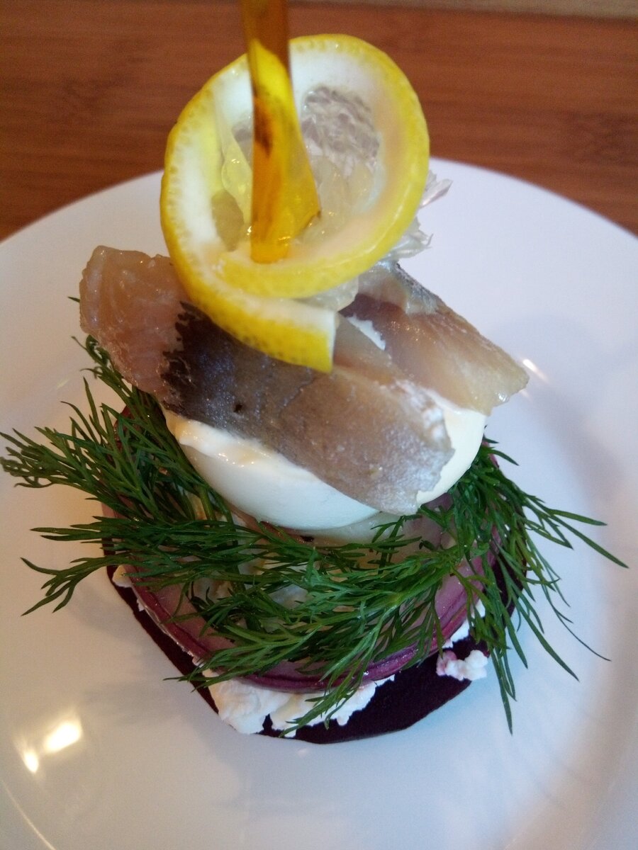Да, сельдь – рыба не из красных, но она традиционна, проста и любима многими. Когда речь идет о сельди, воображение рисует воспоминания молодости: селедочница с ее величеством, щедрые кольца белого лука, сдобренные маслицем, отварная картошечка, да еще с укропчиком. Когда-то это холодная закусочка входила в меню каждого ресторана и подавалась в начале ужина по заказу посетителей, которые, завидев ее, потирали ручки и ближе придвигались к столу. Кто вспомнит эти добрые времена, улыбнется. И даже сегодня мы не можем без нее обойтись. Скучаем. Тянет. Предлагаю фуршетную закуску с простым составом, оформленную в виде канапе. На мой взгляд, его высота подчеркивает значимость этой рыбки, она достойна, чтоб ее возвеличить.) Рецепт возник экспромтом, если после увиденного вы вдохновитесь на поход в магазин, значит, все не напрасно. Ингредиенты на два канапе: Готовим порционно на двух тарелках двадцать минут. 1. Маринуем предварительно в оливковом масле кольца лука с лимонным соком и специями