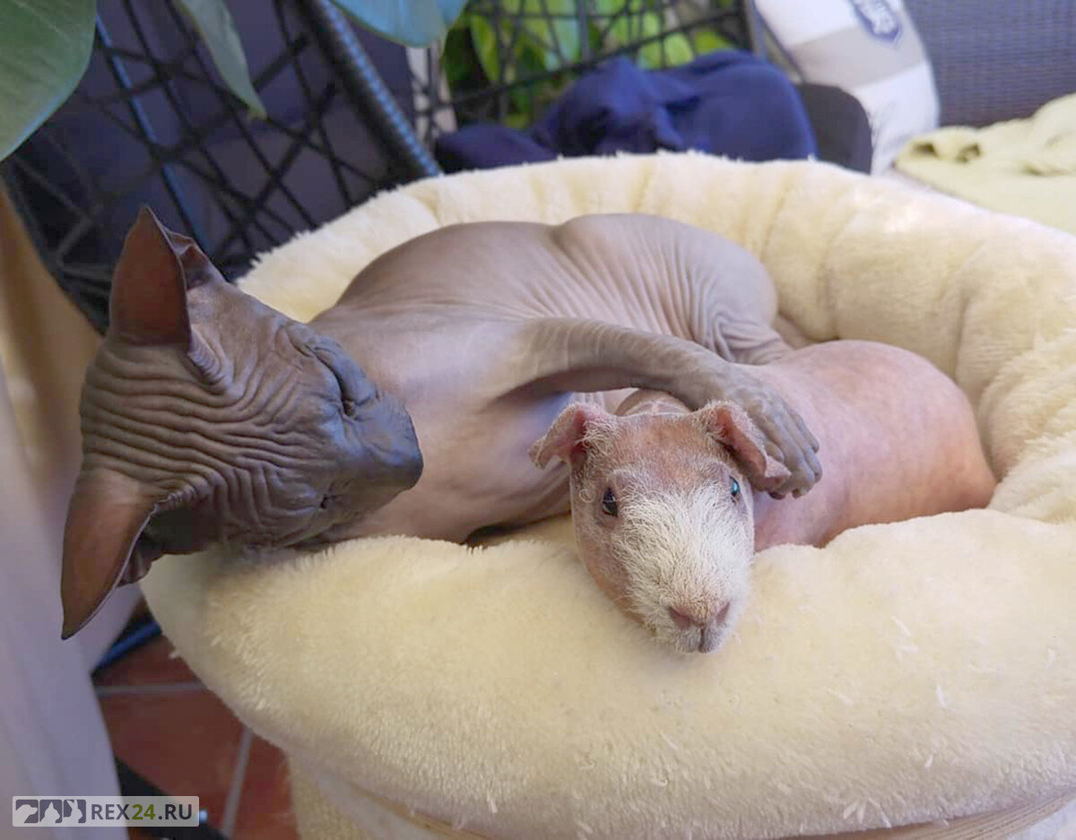 Женщина по имени Оксана Батакиене из испанского города Эстепона принесла в дом морскую свинку. Каково же было ее удивление, когда четыре кошки, проживающие с ней, приютили зверька, как родного. Забавно то, что кошки, проживающие с Оксаной, – сфинксы. Лысая морская свинка практически не выделяется на их фоне. Может, поэтому они приняли нового питомца. Свинку назвали Луисом. Сейчас ему полгода, а кошачье семейство воспринимает его как родного. «Все четыре кошки посчитали Луиса своим братом. Кошки-сфинксы уникальны, они очень общительны, дружелюбны и чрезвычайно умны, даже больше, чем можно подумать. А теперь у нас есть еще и Луис, который приносит в нашу семью немного смеха, улыбок и положительных эмоций», – рассказала Оксана. Она также отметила, что все ее животные обожают обниматься: им теплее, когда они греются друг о друга. Луис чаще всего залезает на спины к котам. Хозяйка подчеркнула, что морские свинки – очень компанейские животные. Кстати, в ДНК морских свинок хромосом на
