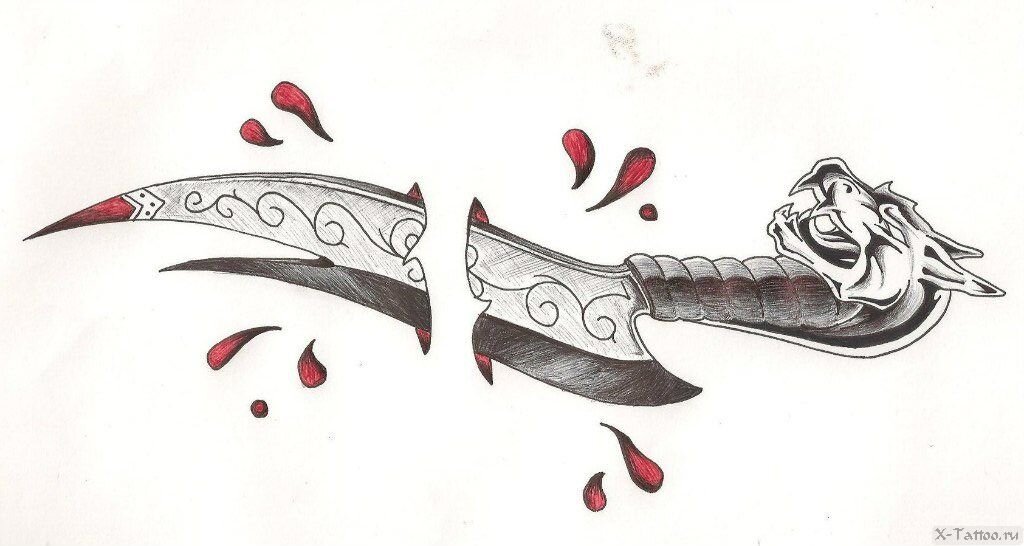 Эскизы тату кинжал уже давно заняли особое место в этом виде искусства и нашли свою группу любителей. Прежде чем наносить на свое тело такой рисунок, рекомендуется тщательно изучить его непростой смысл. О рисунке Основное значение: Однако, в комбинации с другими элементами значение может меняться. Так капающая и стекающая по лезвию кровь символизирует готовность действовать, не задумываясь о возможных последствиях. Пронзающий сердце кинжал — предательство любимого человека, а среди католиков это символ Девы Марии. Сочетание с черепом — смерть. У заключенных такая наколка становится символом жестоких убийств и как бы говорит: «Будь осторожен со мной». Другое дело если холодное оружие находится в зубах у улыбающегося черепа. В 16-17 веке такая символика стала официальной для пиратов и обозначала бесстрашие и свободную от законов жизнь. Если вокруг ножа змея, то будьте уверены — перед вами главарь преступной группировки. Крестообразная рукоять — своеобразный мост между миром живых и