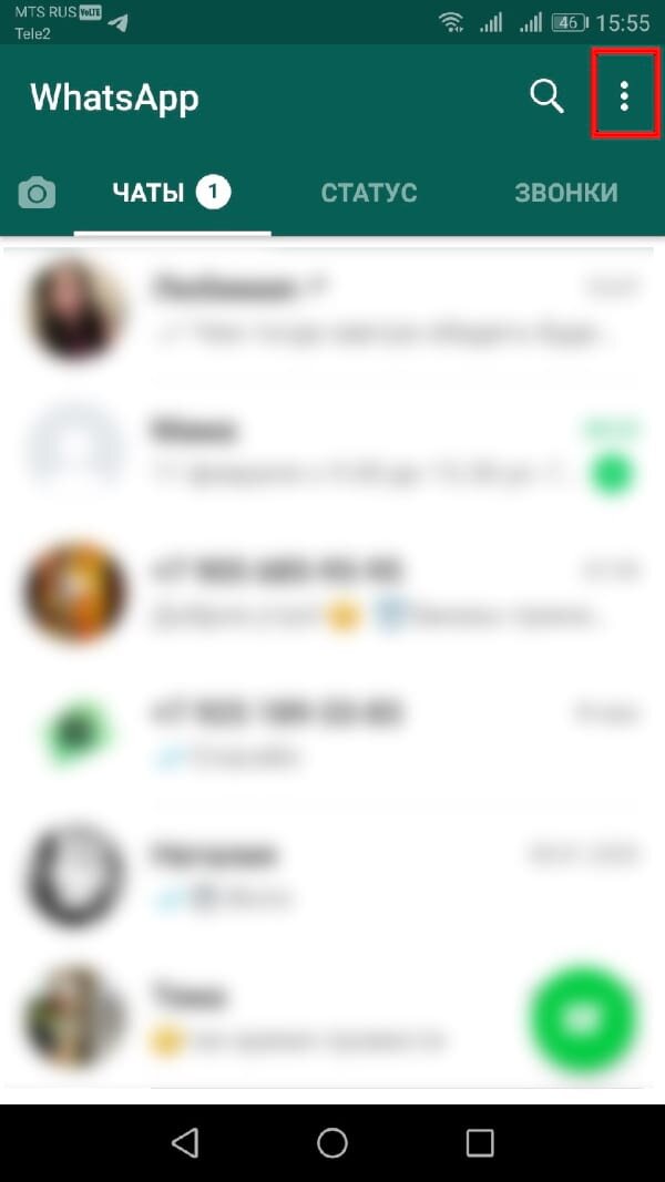 Откройте приложение WhatsApp и нажмите кнопку меню из трех точек на верхней панели инструментов.