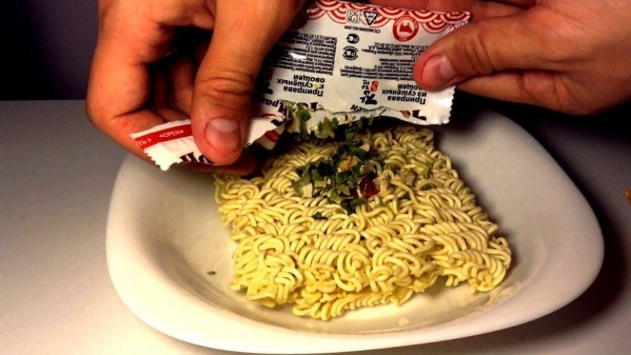 Сырьём для приготовления теста является зерно низкого сорта. Его перемалывают. В серую муку добавляют премикс – биохимическую минеральную добавку. Этот ингредиент напоминает комбикорм, но отличается от него химическими веществами со вкусоароматическими добавками, в том числе и глутаматом натрия. Этот компонент и держит покупателя на крючке. Усилители вкуса делают лапшу приятной, поэтому некоторые любители фастфуда хрустят ей, даже не заливая водой. Учёные Великобритании доказали, что после употребления «Доширака» улучшается настроение, учащается сердцебиение. «Суп бомжа» с ароматом и знакомым вкусом становится лёгким наркотиком именно из-за содержания глутамата натрия. Об этом знают владельцы фастфудов. Они в исходное сырьё добавляют соль натрия мешками. Как видите, никакой муки высшего сорта и яичного порошка нет. Вместо него используют эмульгатор-загуститель. Приятный жёлтый оттенок получают из-за присутствия в массе сахарного колера или красителя Е-150. Тесто тщательно перемешив