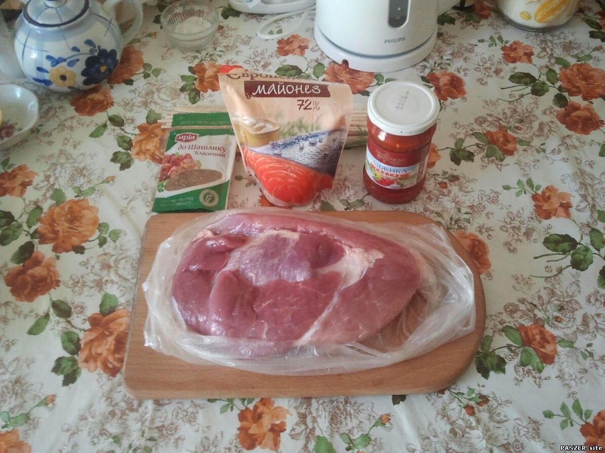 Короче, на базаре было куплено мясо свиньи, приправа для шашлыка (решил попробовать), майонез, аджика и лук. В общем, задуманы домашние шашлыки. Мясо резал по разному. Часть кубиками, а другую часть, ту, которую сам планировал сожрать, решил порезать гармошкой, ну, как-то я видел такой шашлык.