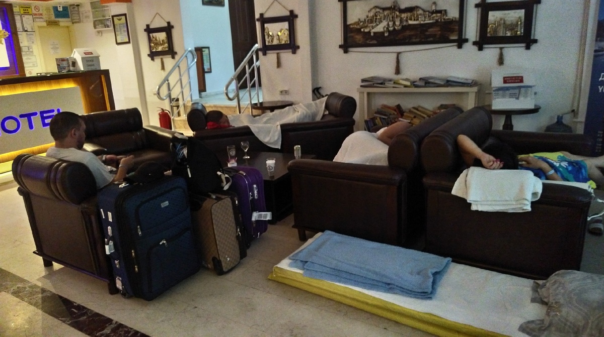 Вот так люди ждут номера. Это уже всех остальных увезли по другим гостиницам - баракам. С этих гостиниц переселенцы бегом бежали обратно на диваны.