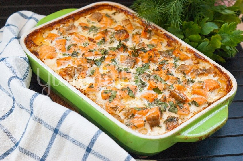 Чередовать слои, каждый слой посыпать солью и специями. 4. Смешать 150 мл.сливок и 150 мл. молока. Залить сливочно-молочную смесь в форму с картофелем. Жидкость должна почти прикрывать картофель. 5. Запекать в заранее разогретой духовке 1 час. 6. Если верхний слой начал сильно румяниться, то накрыть форму фольгой. 7. Сёмгу нарезать на небольшие кусочки, залить её оставшимися 100 мл. сливок и добавить нарубленную зелень. Перемешать. 8. На готовый испеченный картофель посыпать тёртый сыр. Совет Проверьте картофель на готовность, если он ещё не готов, то поставьте его в духовку ещё на некоторое время. 9. На сыр выложить кусочки сём