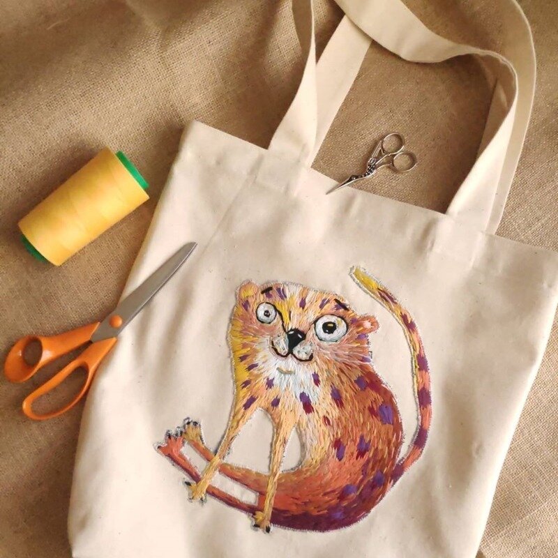 Девушка дает имена некоторым из них. Кот Лео стал главным украшением сумки-авоськи бежевого цвета. Вышитый яркими нитками, немного непропорциональный, забавный, с тоненькими лапами и глазами разного размера, он будет акцентной частью образа.
