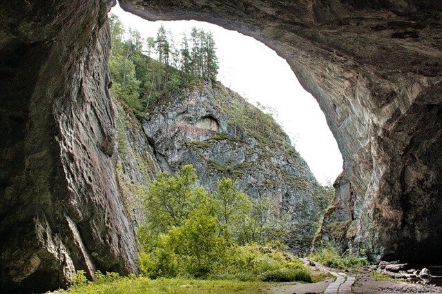 Есть рисунки лесенок, хижин, геометрические линии, необычные знаки — всего их зафиксировано около 200 элементов. Из них хорошо сохранилось около 30. С 2012 года некоторые залы пещеры закрыли для туристов, ввиду того, что нарушился микроклимат, и уникальные рисунки стали блекнуть. В первом пещерном зале выставлены копии закрытых экспонатов. Почти все изображения сделаны красной краской, которую древние люди делали из смеси охры и животного жира. Несколько угольных изображений более ранние – это голова медведя и волка. Проведенные раскопки в этом месте выявили стоянку древнего человека. Были найдены камни, на которых художники растирали краски, орудия труда – скребки из известняка, жировые лампадки; обнаружены захоронения ч