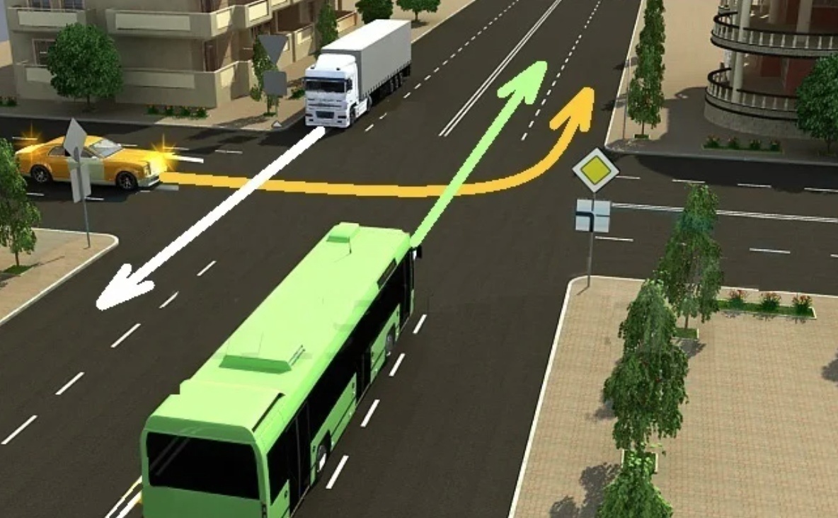 Повторения - мать учения. Все знают эту замечательную поговорку? Предлагаю не медлить и повторить в очередной раз повторить правила дорожного движения. На этот раз коснемся темы "Проезд перекрестков". Видим нерегулируемый (отсутствуют светофоры или регулировщик) перекресток, на который собирается въехать три транспортных средства (ТС): легковой автомобиль, грузовой автомобиль, автобус. Вопрос: кому должен уступить дорогу водитель желтого автомобиля? Будьте внимательнее, так как в этой ситуации возможно два варианта ответа. Давайте разбираться. Автобус и легковой автомобиль находятся на главной дороге, грузовик - на второстепенной. Об этом говорит табличка 8.13 "Направление главной дороги". Получается, что "легковушка" и автобус должны руководствоваться правилами проезда перекрестков равнозначных дорог - пункт 13.10 ПДД РФ (в случае, когда главная дорога меняет направление...). Пункт 13.11 говорит, что на перекрестках равнозначных дорог преимущество за тем, кто справа, т.е. автобус прое